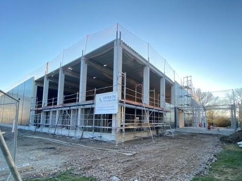 Ganz schön was los im Olfetal: Nach der Vertragsunterzeichnung im Juli und der Grundsteinlegung im Dezember 2021 herrscht seit Anfang diesen Jahres auf der Baustelle an der Porschestraße Hochbetrieb. So wurden Fundamentarbeiten abgeschlossen, Außenwände hochgezogen und die Dachkonstruktion fertiggestellt. Insgesamt sind bisher 1055 m³ Beton, 130 Tonnen Baustahl verbaut worden.