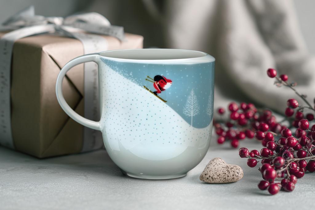 Der hochwertige, bauchige Henkelbecher, gefertigt von der Marke Villeroy & Boch aus der Serie NewMoon, liegt angenehm in der Hand und besticht durch ein zeitloses und modernes Design. Als Dekor schmiegt sich ein winterlicher Berghang, auf dem der Weihnachtsmann höchstpersönlich auf Skiern ins Tal saust - fröhlich, schwungvoll und mit einer Extraportion Festtagsstimmung.