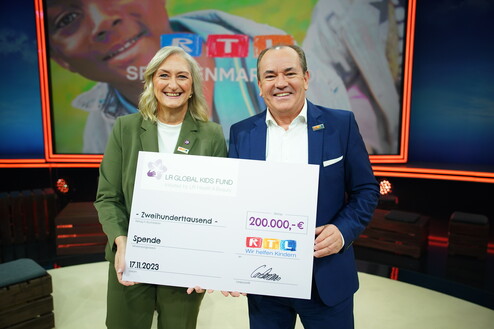 Der LR Global Kids Fund e.V. arbeitet seit 10 Jahren mit der „Stiftung RTL – Wir helfen Kindern e.V.“ zusammen, um benachteiligten Kindern die Chance auf eine bessere Zukunft zu ermöglichen. Den jährlichen Höhepunkt der vertrauensvollen Zusammenarbeit bildet der RTL-Spendenmarathon, an dem der LR Global Kids Fund e.V. auch in 2021 teilnahm. Dort überreichte Andreas Friesch, Vorsitzender des LR Global Kids Fund e.V., den Spendenscheck in Höhe von 200.000 Euro an Wolfram Kons. Mit dieser Spende wird das RTL-Kinderhaus in Ahlen langfristig unterstützt.